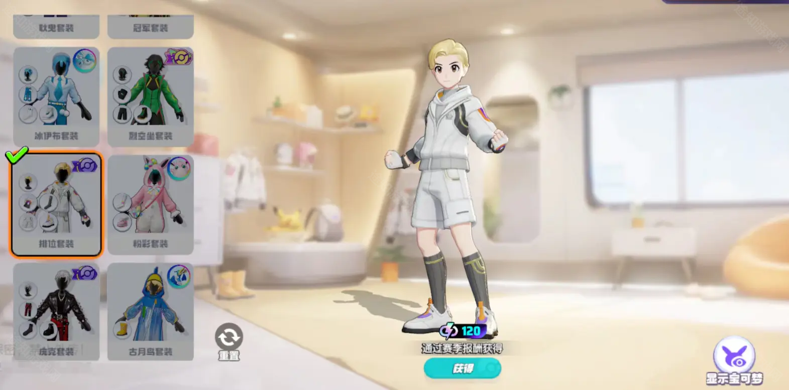 答:极光音浪套装、皮卡丘套装、厨师套装、探险套装、田园洋装、消防套装和排位套装