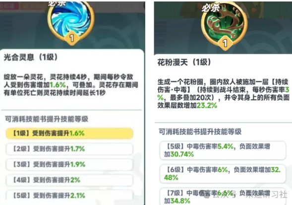 对比老库比森叶灵的必杀,持续时间覆盖全程,最高中毒伤害率可叠加至20层,那么满级必杀最高达到中毒伤害率132%,且负面效果层数再提升34%。