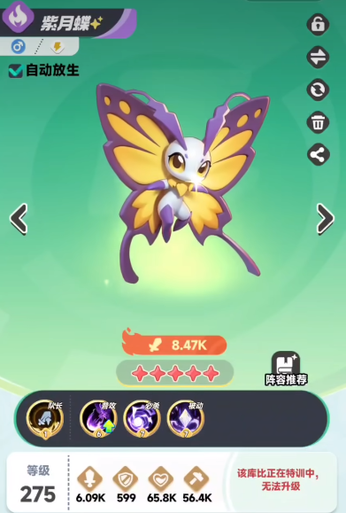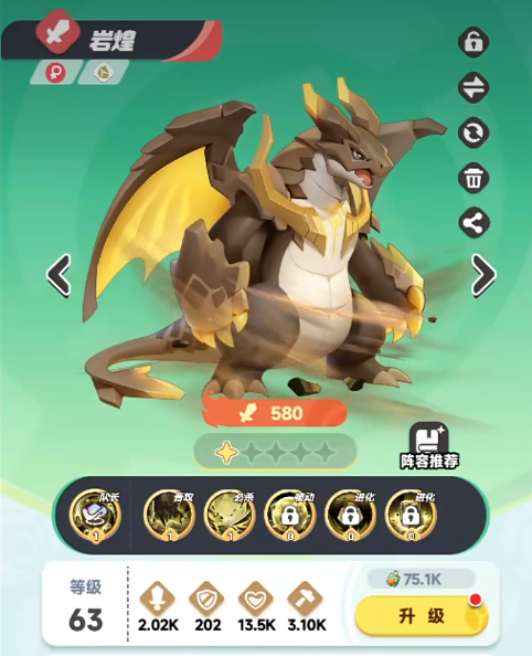 假如想要使用这个角色,比较适合把它放到前排,虽然防御能力优秀,但战斗力不足,可以给这个角色搭配紫月蝶作为输出,这样这个宠物可以主打输出,岩煌作为队伍的防御抵抗伤害,加上菇隆隆,承担整个队伍的控制,能让这支队伍变得比较均衡,不管是应对哪种状况,都可以让角色通过释放自身能力的方式,互相合作保护队伍里的其他成员。