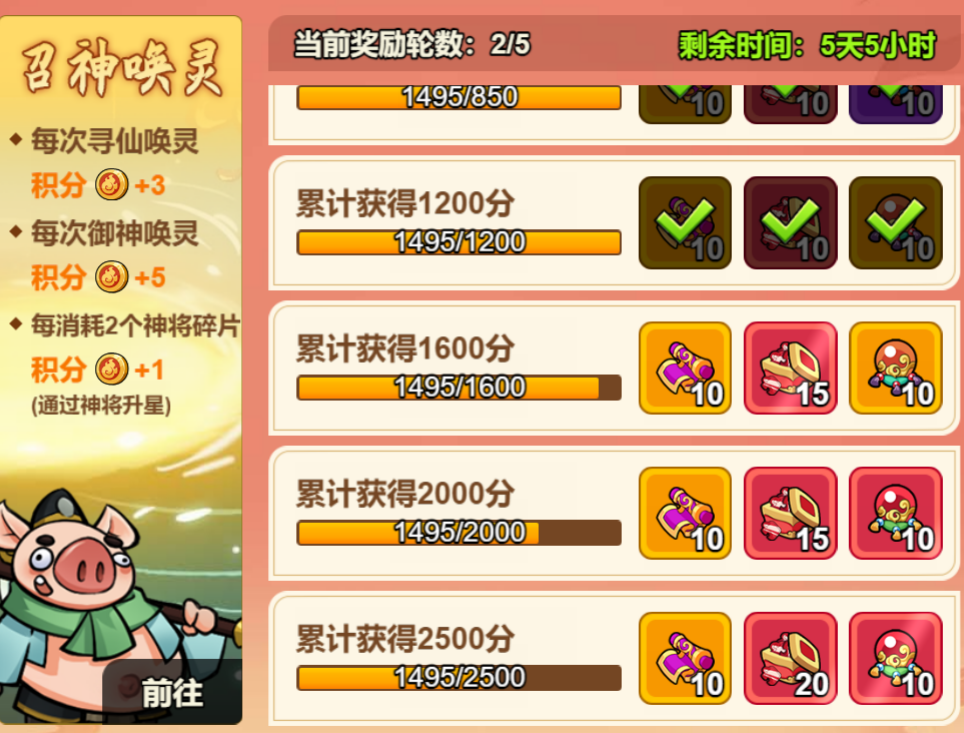 4. 我们区是召唤周活动开区,不清楚是不是所有新区开始的周活动都是召唤,是的话就随便用,升星,召唤券使用都给积分,到达一定积分领奖励,一轮需要2500分,一定要确定自己能做整轮了再开始做