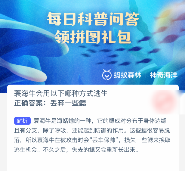 支付宝蚂蚁森林神奇海洋2025年7月3日问题已经更新,今日题目是:蓑海牛会用以下哪种方式逃生?正确答案是:【丢弃一些鳃】。蓑海牛是海蛞蝓的一种,它的鳃成对分布于身体边缘且有分支,除了呼吸,还能起到防御的作用。