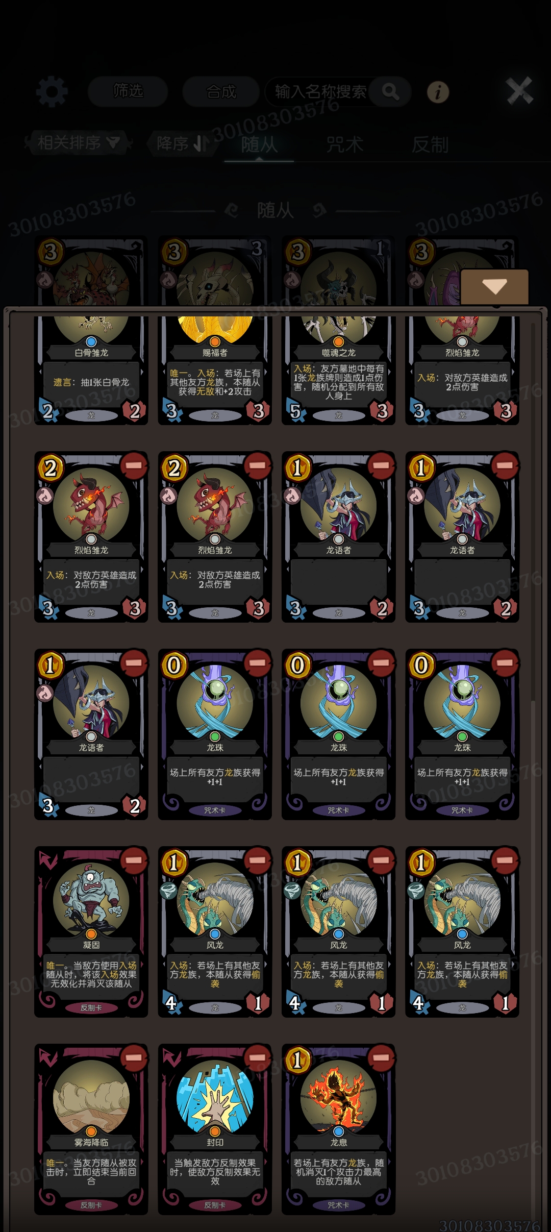 月圆之夜每回合固定恢复3费的机制注定了费用曲线是一个不需要考虑的点。在选择随从时,我们的标准是:优先火属性龙族、低费、高攻、效果可以造成伤害的下级。