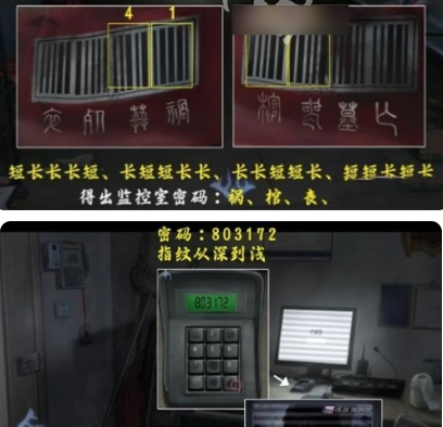 18、进入监控室,根据键盘上指纹深浅获得密码803172,输入查看视频,然后在抽屉里获取细铁丝,插入锁芯完成小游戏就能出去。