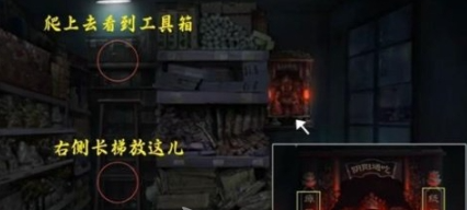 7、将便利店右边梯子放在左侧上去能看到工具箱,点击右侧的财神得知需要瘴鼠和纸棺,左侧的地上就有纸棺,门外的垃圾桶有瘴鼠。