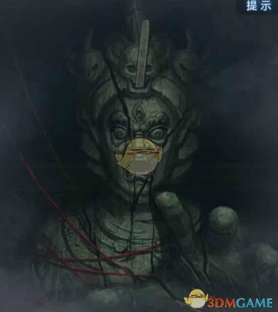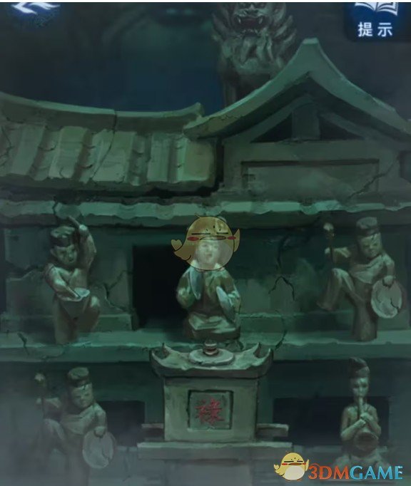 完成小游戏后查看中间位置雕塑,调整雕塑为前面挂牌上的乐器,第一排是【鼓-钹-锣】,第二排是【锣-禄-唢呐】,注意中间有个禄需要调整哦,调整完毕如上图,房屋倒塌下面露出手臂,先拿走后面的【泥娃娃】和【跳舞人偶】,然后记下来压在下面的手臂方向为【上下右下左上】。