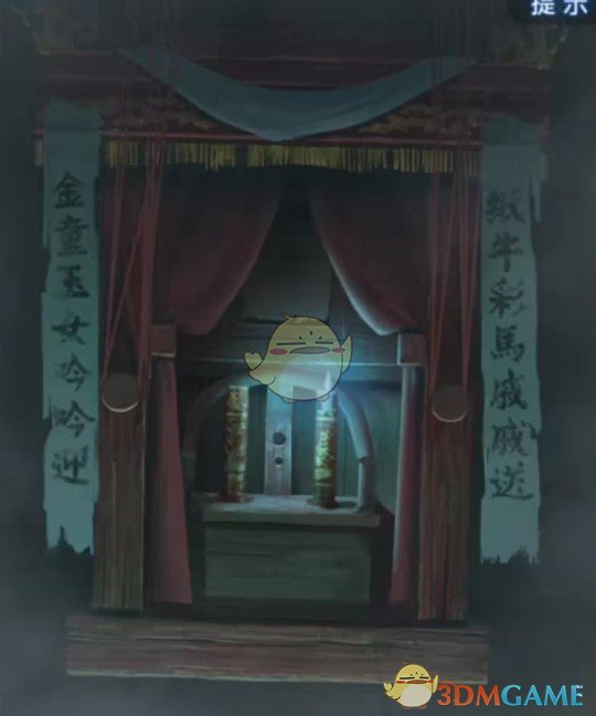 从上面牌匾位置拿到【喜烛】,然后注意看举着牌子的字,稍微拼一下能拼出来【映镜娘】,所以大概我们是需要找个镜子放在畿娘子面前的。