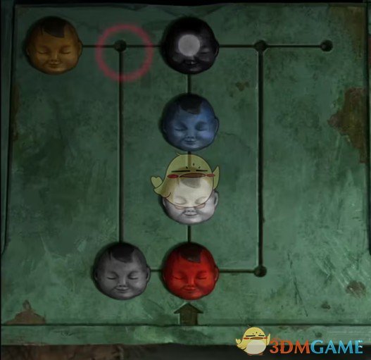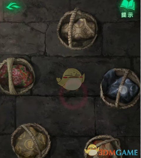可以自由行动之后先看一眼右下角,五个竹篮对应地上五个图案,将竹篮都放在对应图案上即可,最上面是铜钱,左上角花,右上角鸟,左下角福,右下角鱼,放好后如上图,分别在右上角竹篮拿到【木头哨子】,左下角竹篮拿到【火柴】,最上面竹篮拿到【木头手枪】。