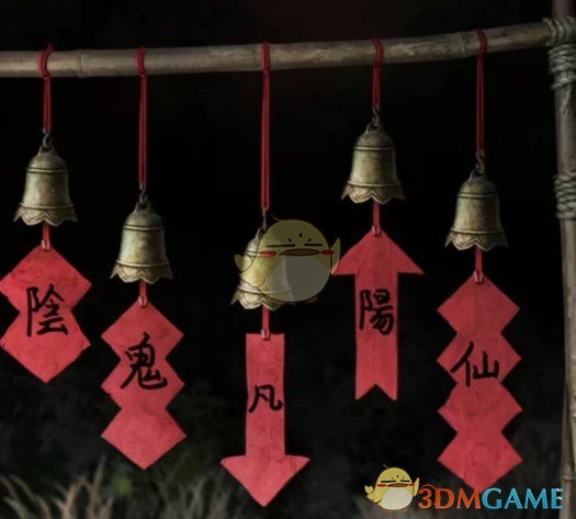 出门就有剧情,剧情过后查看左边的风铃架子,放上最后一个【风铃】后一阵风吹过风铃集体变魔术,记下来风铃下面的形状和文字,注意有两个是箭头的形状,所以大概率先是箭头指使的两个在头尾,中间按照有几个菱形来排列,所以我们获得的线索应该是【阳-阴-鬼-仙-凡】记下来。