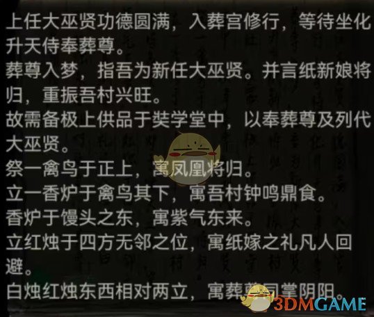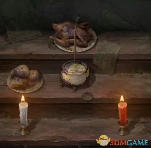 然后查看一下中间的账本,账本的第二页有重点,重点就是贡品的摆放了,首先是鸟在中间最上面,然后鸟下面是香炉,香炉左边是馒头,上下左右都没东西的是红烛,所以红烛只能在右下角,那么对着的白烛就在左下角了,记下来后出门后退去学堂摆放。