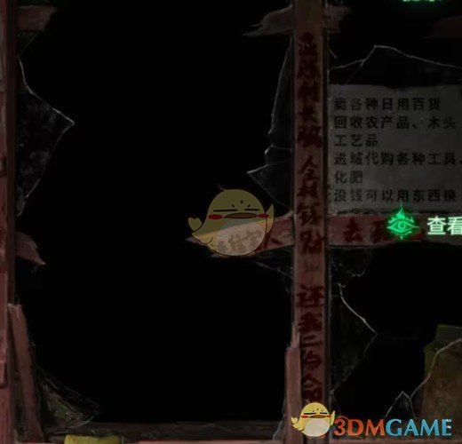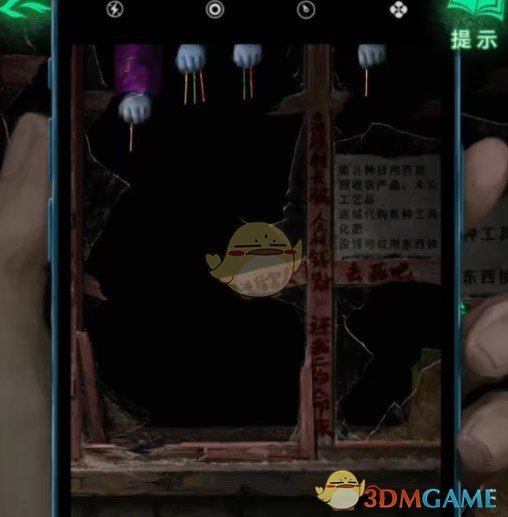 向后转到拖拉机场景,查看一下左边破破烂烂的窗口,右上角有个提示可以回收木头工艺品,那么我们就把前面拿到的【木头哨子】直接扔进去,往左边大的窗口扔,扔进去之后从里面就扔出来一包【豆奶】,后退一下到车场景,右边石塔用手机看能看到里面有个饿坏了的婴儿,把【豆奶】扔进去后就能拿到一张【年画】。