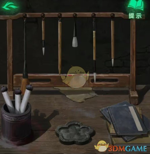 拿到红绳后再次出门向后转回到学堂,对右边的机器使用红绳就能看戏了,注意看戏的时候是有不同图案的,记下来依次出现的是【小花-4本书-3个卷轴】,这就是左边书桌的全部摆放线索了,看完的时候会有小高能不要被吓到,地上拿到【锤子】后按照这个线索摆放一下左边书桌如下图,摆放完毕地上拿到一个【风铃】。