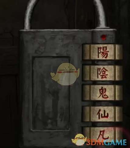 再次回头和婆婆对话剧情,剧情过后查看左上角的二楼,二楼的门锁就是五位汉字密码,调整为【阳-阴-鬼-仙-凡】后果然开门,这次进入了有冰箱的场景,这里解谜就比较密集了哦,不过没有什么高能不用怕,首先查看左边的冰箱,打开上层发现一个小棺材,使用棺材钉后获得一块【小木板】。