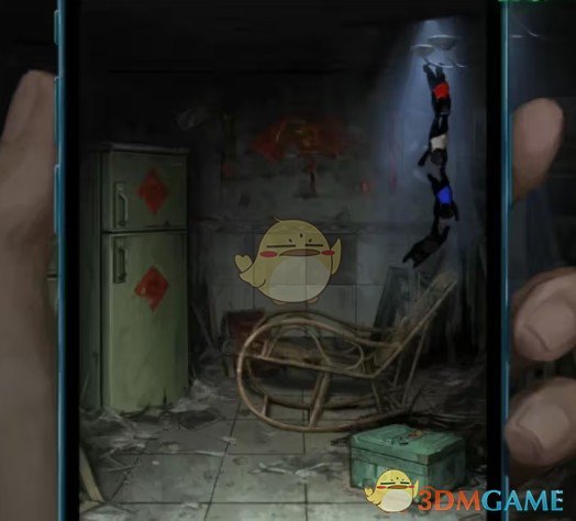 然后查看一下摇椅后面的墙壁,使用【锤子】砸开后发现有个就怕喝朱砂茶的鬼怪,好的这就去找朱砂,使用手机查看一下一直在动的摇椅后发现上面吊着四色小鬼,记下来从上到下是【红白蓝黑】,然后查看摇椅右边的箱子,中间位置画了个向上的箭头,也就是从下往上为【红白蓝黑】,调整一下打开,右边的小袋子中拿到【朱砂】。