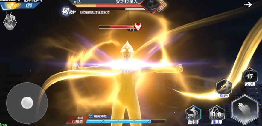 同时通过普攻积攒能量,当能量满格时,释放必杀技终极光之刃,会根据他自己当时的血量数值3.5%来造成真实伤害,然后进行连招循环,动作是先压制-突刺-幻影剑,最后接一个光之刃这样的输出链,便可以逐步将安培拉星人的血量压制到110层左右,当终极赛罗的能量耗尽后,便轮到闪耀迪迦登场了,闪耀迪迦进场后,首先使用闪耀爆裂破霸体,紧接着施展闪耀冲锋击退目标,为后续的攻击创造良好的条件。