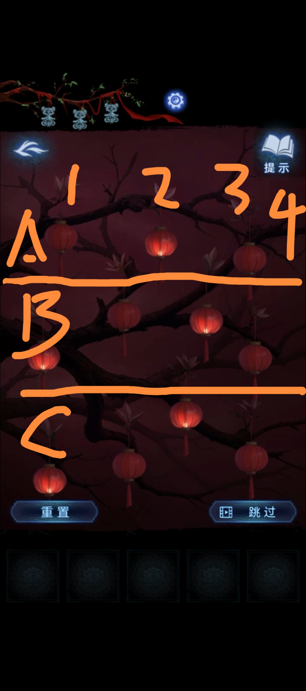 两道黄色横线将灯笼划分为三行(第一行有三个灯笼)分别标记为A B C