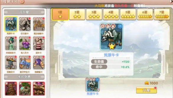 卡片星级从1星到7星,星级越高增加的属性越多。升星需要消耗低星同名卡和同级卡,建议强求不要用融合功能强求卡片。