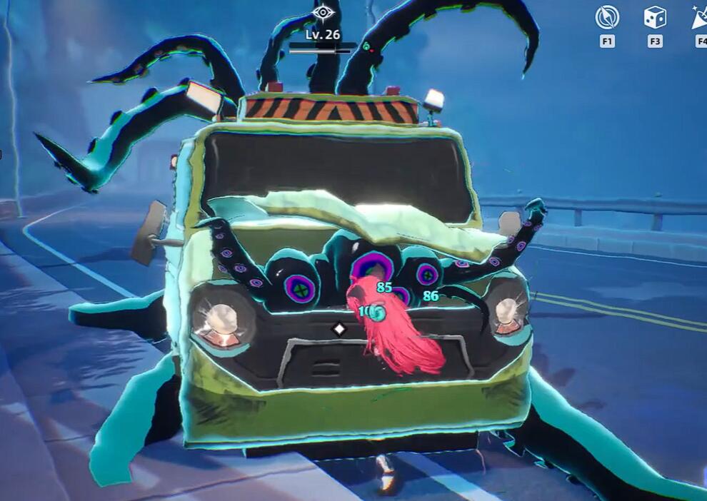 目标卡车为深绿色车身,车头悬挂荧光粉章鱼标识,远距离即可识别。卡车沿公路自西向东匀速行驶,玩家需在其距离50米左右时冲出掩体,横向拦停。若站位偏离车道中心可能导致拦截失败,推荐使用角色滑铲技能(双击方向键)快速突进至路中,卡车被逼停后自动进入战斗。