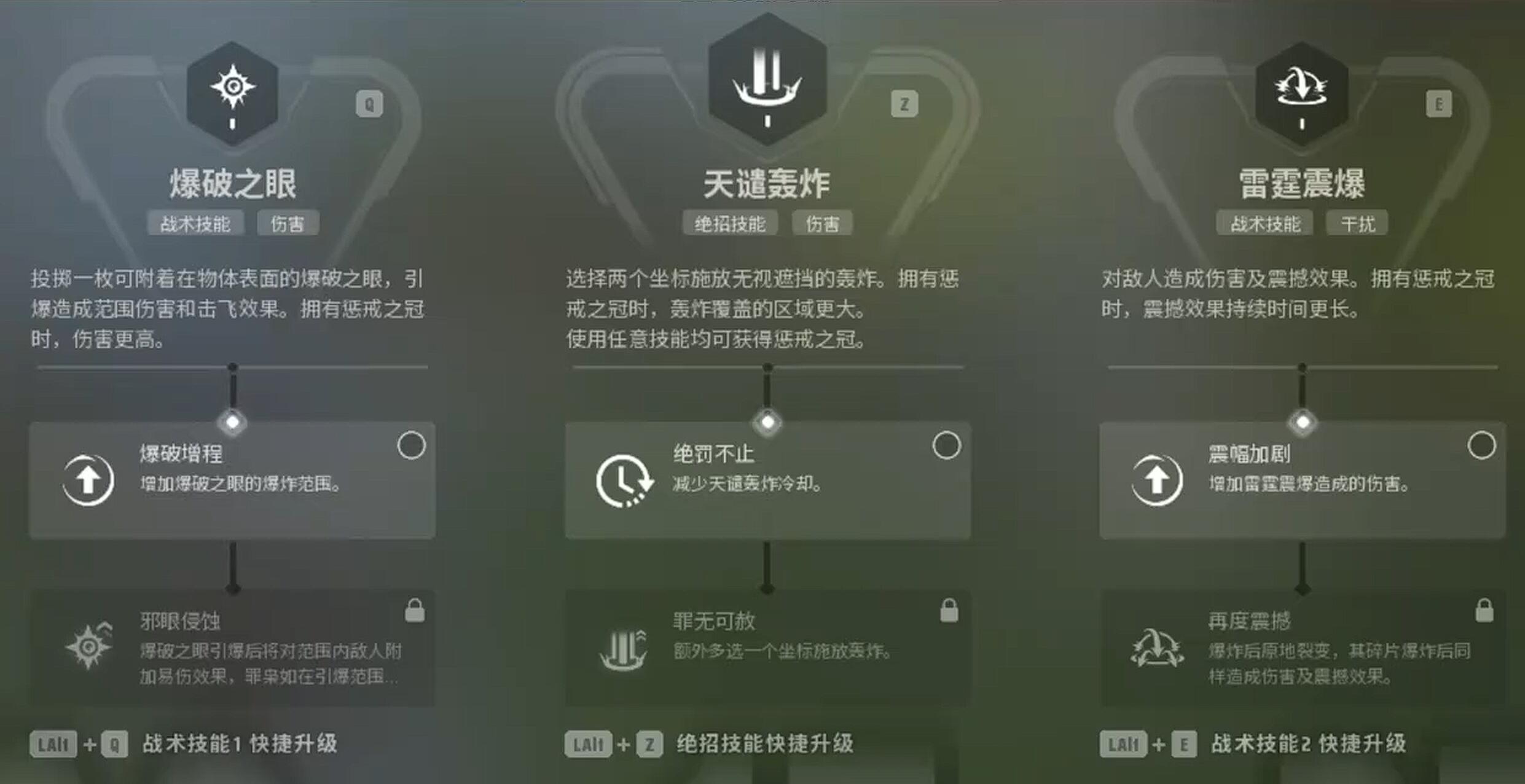 罪枭的核心在于利用“惩戒之冠”强化技能效果。开局优先将E技能“雷霆震爆”升至3级,此举能将震撼控制时间延长至3.5秒,尤其面对敌方召唤物(如桃井的飞龙)时,提前投掷震爆弹可打断其行动,为队友创造集火机会。Q技能“爆破之眼”前期只需1级,因其核心功能“炸弹跳”(自我击飞位移)在1级已解锁,升级仅小幅提升伤害而非范围,资源有限时收益较低,平原地形可以考虑二级,能增加一点爆炸距离与伤害。