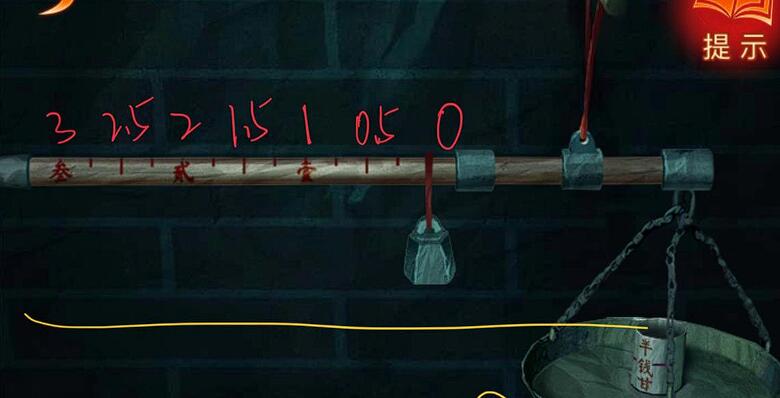 继续清空容器倒入苦原料,移动秤砣至“壹”字所在竖线(刻度1)时平衡,得出半钱甘等于一钱苦。配方中苦需一钱半,即一杯半(倒一整杯再加半杯)。最后测试酸原料,秤砣移至“贰”字竖线(刻度2)时平衡,表明半钱甘等于二钱酸,因此一钱酸仅需半杯。实际调制按“两杯辛、一杯半苦、半杯酸”操作即可。需注意游戏判定机制特殊,若未触发成功,可尝试微调:改为两杯辛、两杯苦、一杯酸,多数玩家实测此法更易通过,不然的话会触发牛马咖啡。
