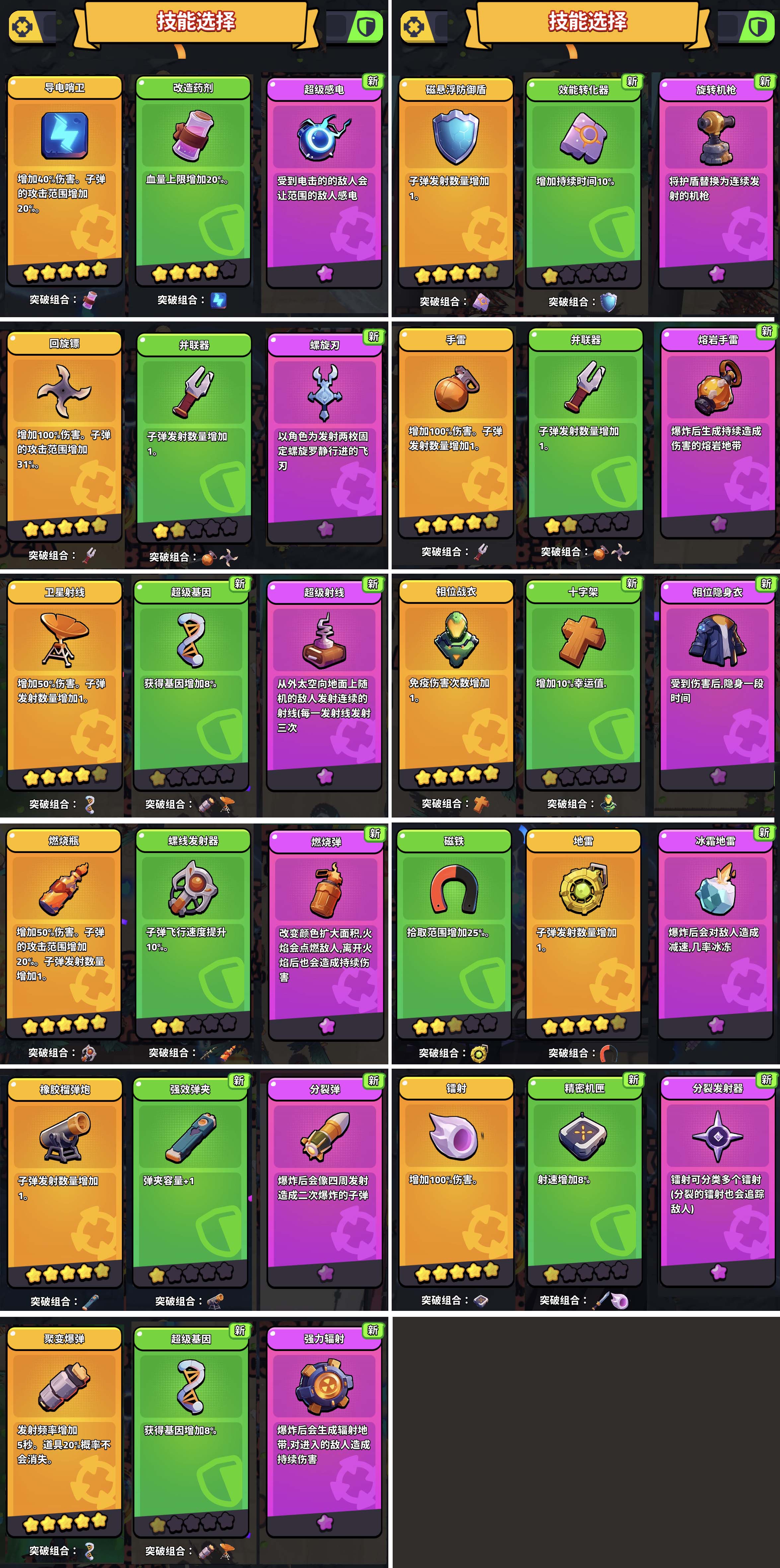 5星回旋镖(增加100%的伤害,子弹的攻击范围增加31%)与1星并联器(子弹发射数量增加1)组合可以突破进阶变为螺旋刃。