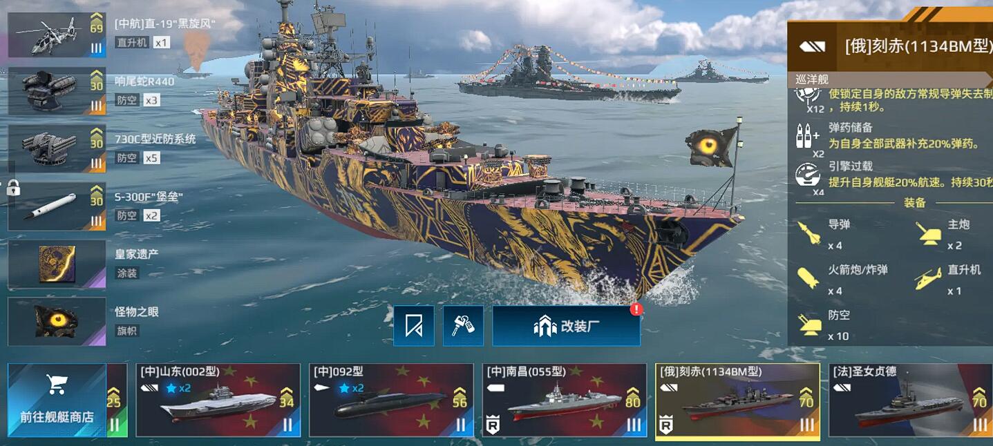 武器配置刻赤号拥有两组可替换的导弹插槽和两组火箭炮插槽。Kh-35导弹射程适中,适合打击中距离水面目标,而RBU-12000则能有效压制潜艇。防空系统方面,该舰搭载了S-300F“堡垒”远程防空导弹(锁定目标后自动发射)和M-22“飓风”中程防空系统,能有效拦截敌机与反舰导弹。舰后面的Ka-58“黑幽灵”直升机可执行侦察与反潜,提升战场感知能力。