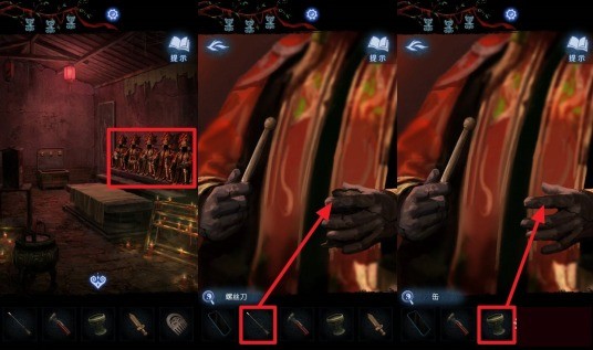 纸嫁衣8千子树第四章杖头木偶戏怎么过,点击右侧的雕像,在道具栏选择【螺丝刀】(汽车后备箱里获得)把雕像手里的坏缶撬掉,再选择道具栏的【缶】(完成古琴谜题获得)放进雕像手中。