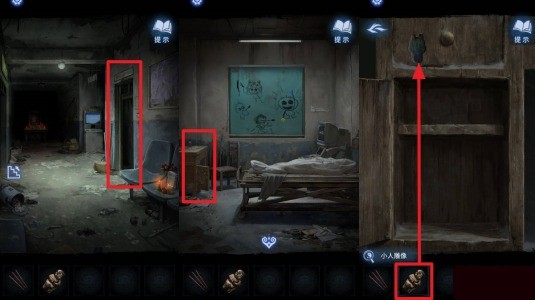 进入一楼走廊右侧的门,点击房间左侧之前打开的木柜子,在道具栏选择【小人雕像】放在柜子上方。