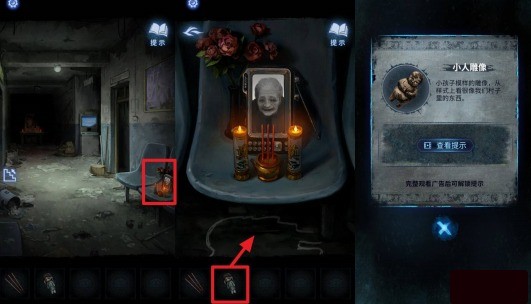 完成办公室锦旗谜题在停尸柜拿到布娃娃之后回到一楼,点击椅子上的灵位,选择道具栏中的【布娃娃】放在灵位下方,获得【小人雕像】。