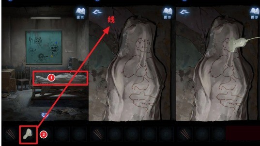 拿到探头后,点击房间中间的白布,将探头接在左上方断掉的线上,组成探头,之后需要在电脑和白布上重复切换以获得6位数字密码。首先,将探头放在脑子图案上。