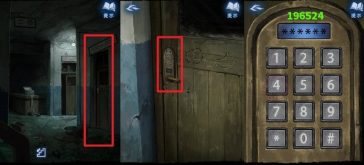 回到二楼走廊,点击画面最右侧的门,门上可以看到脑子和胃图案的提示,点击密码锁,输入密码【196524】进入房间。