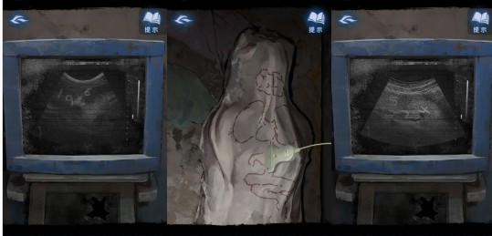 把探头放在脑子图案上,返回查看显示屏,获得密码【196】,再把探头移动到胃的图案上,返回查看显示屏,获得密码【524】。