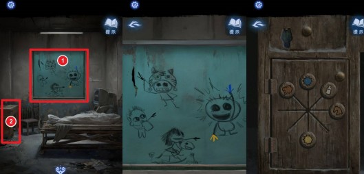 打开一楼走廊右侧木门并进屋之后掀开帘子(有布娃娃小高能),前方玻璃上是解谜线索,记住奶嘴、蓝色箭头、黄色箭头、马头和虎头小孩所指方向,然后点击房间左侧的木柜子,将对应的按钮移动到正确位置,打开柜子。