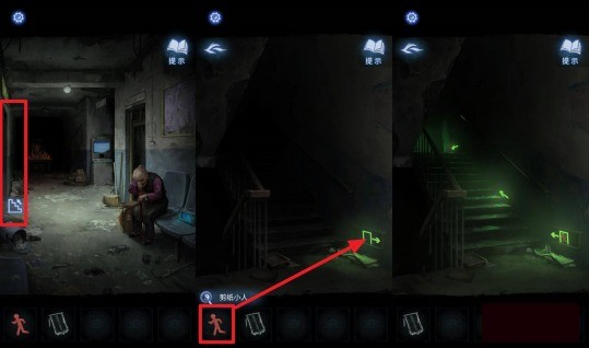 返回屋外的走廊,观看剧情。看完剧情后,点击走廊左侧的楼梯标志,选择道具栏中的【剪纸小人】,将小人放在墙底部的安全出口标志上,解锁二楼。