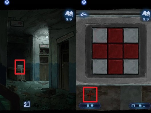 来到二楼后,点击走廊里木桌上的医疗箱。点击对应的方块,将图案变成一个红色十字,线索就在方块左下角。