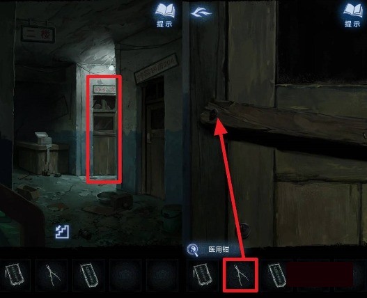 在二楼走廊点击中间的办公室木门,用【医用钳】撬下木板上的钉子(天花板有小高能),进入办公室。