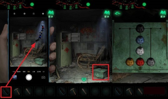 纸嫁衣8千子树绿盒娃娃头解谜怎么过,玩家开启二楼门上的密码锁后进入房间,用手机查看整间屋子,可以看到摇椅上方倒挂着4个小孩,颜色分别为【红、白、蓝、黑】。点击摇椅右下方的绿色盒子,开始解谜。
