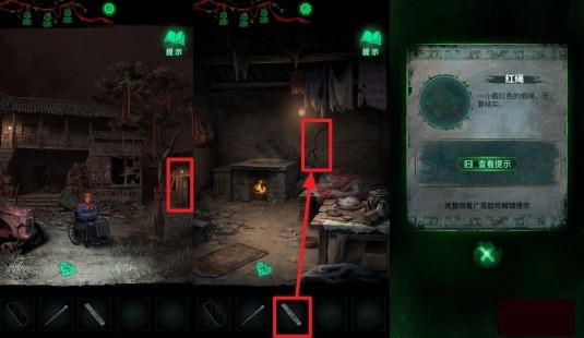 返回汤婆婆所在区域,进入贴门神之后进入的屋子,用【直尺】把墙缝里的东西勾出来(有小高能),获得【红绳】。