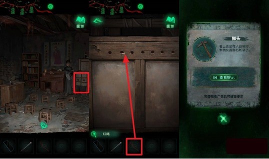 返回车旁边的学堂,点击说书木偶旁边的白箱子,选择【红绳】系在断掉的绳子上,再继续点白箱子触发剧情,获得【榔头】。