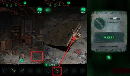 进入学堂之后,点击右下方地上的门,在道具栏选择【玩具手枪】放在伸出的手上,获得【直尺】。