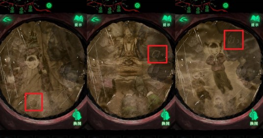 刚才木偶播放的图画上有线索,再次点击白箱子可以查看,右下角换图可以看不同的画。获得【花砚台+书4卷轴3】的线索。