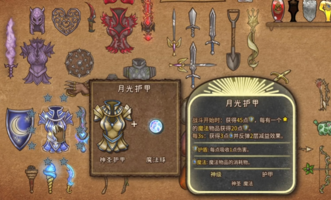 月光护甲归属于护甲类别,兼具神圣与魔法属性,能为玩家提供一定护盾值,且每存在一个魔法物品,护盾值还会进一步增加,在战斗过程中每3秒它会为玩家回复魔法值,并反弹2层敌方施加的减益效果,同时它设有3个宝石孔,为玩家进一步强化属性提供了拓展空间,从合成途径来看月光护甲由神圣护甲与魔法球组合而成,这种合成方式决定了其在属性上融合了两者的部分特质,并且在与其他具备神圣或魔法标签的装备搭配时,有可能触发额外的协同效果。