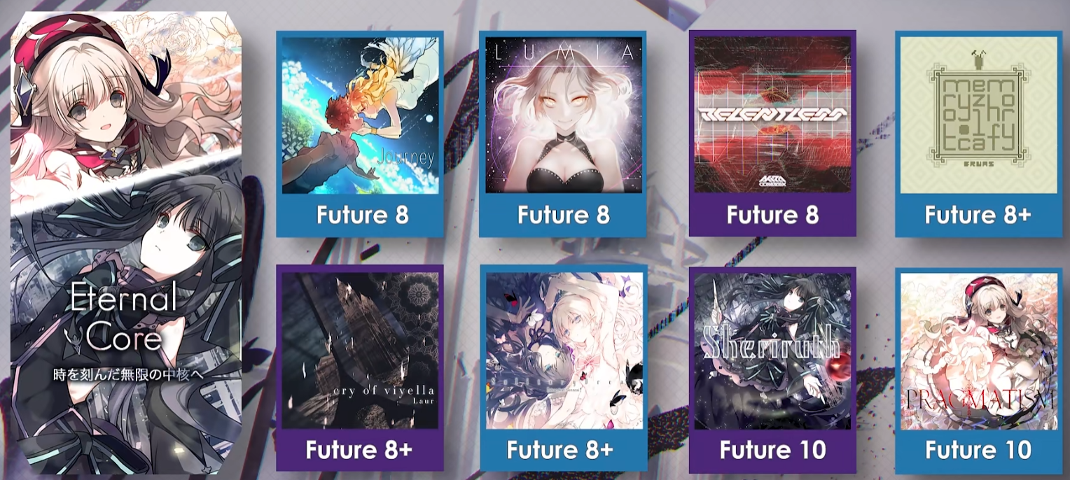 而要论性价比之王,则当属我们的曲包“Eternal Core”,也叫做EC包。作为游戏最初的曲包,其囊括的曲目整整11首曲目,从8+至10+,甚至还有一个最难的11曲目,EC包都有。而其曲目中则可以说包含了目前游戏中所有的音乐节奏,单点,长交互,八分键盘等等,这首曲包中应有尽有。对于刚刚入门的小伙伴们来说,EC包可以说是最值得购买的了。