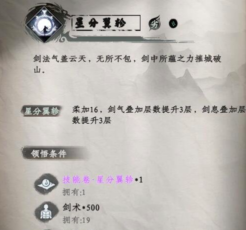 星分翼轸:此秘技,使用该技能可提升16点的柔属性,并且将剑息和间气叠加层数,分别提升到三层,不过需要玩家注意,它是有一定领悟条件的,获取技能卷星分翼轸,剑术必须要达到500,悟性要超过200。