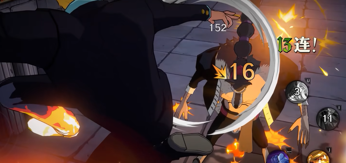 山治的技能一——“手肉Shot”是他空中连击的重要手段,能够快速击飞敌人,并通过普攻再次浮空。在恶魔风脚状态下,技能一得到强化,能够打出一套更为猛烈的飞踢连击,同时衔接恶魔风脚高级绞肉技,使敌人处于持续的火焰伤害中。技能二——“羊肉Shot”则是一招快速下压的踢击,可以调整起跳位置,通过摇杆操作改变攻击方向。在恶魔风脚状态下,技能二的效果进一步提升,能够在空中进行多段重击,同时进入绞肉状态,释放更加猛烈的火焰攻击。