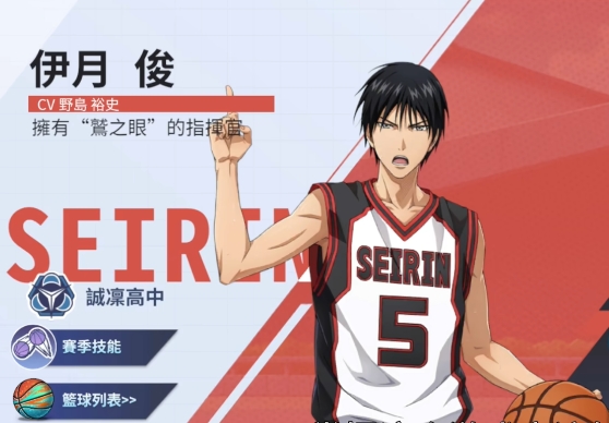 伊月俊:定位为全能控卫的伊月俊拥有独特的鹫眼全场视野技能,持球时可透视对手防守漏洞并提升全队10%移动速度,其声东击西传球机制能让接球者获得0.5秒无敌帧,完美契合快攻节奏,作为AOE伤害型选手,伊月的三分投射与突破分球均衡发展,尤其适合新手过渡期使用,在天梯赛中,搭配水户部凛之助的勾手射篮可形成内外结合的进攻体系,通过灵活传导球不断压缩对手防守阵型,是一个万金油类的球员,也是性价比很高的球员。