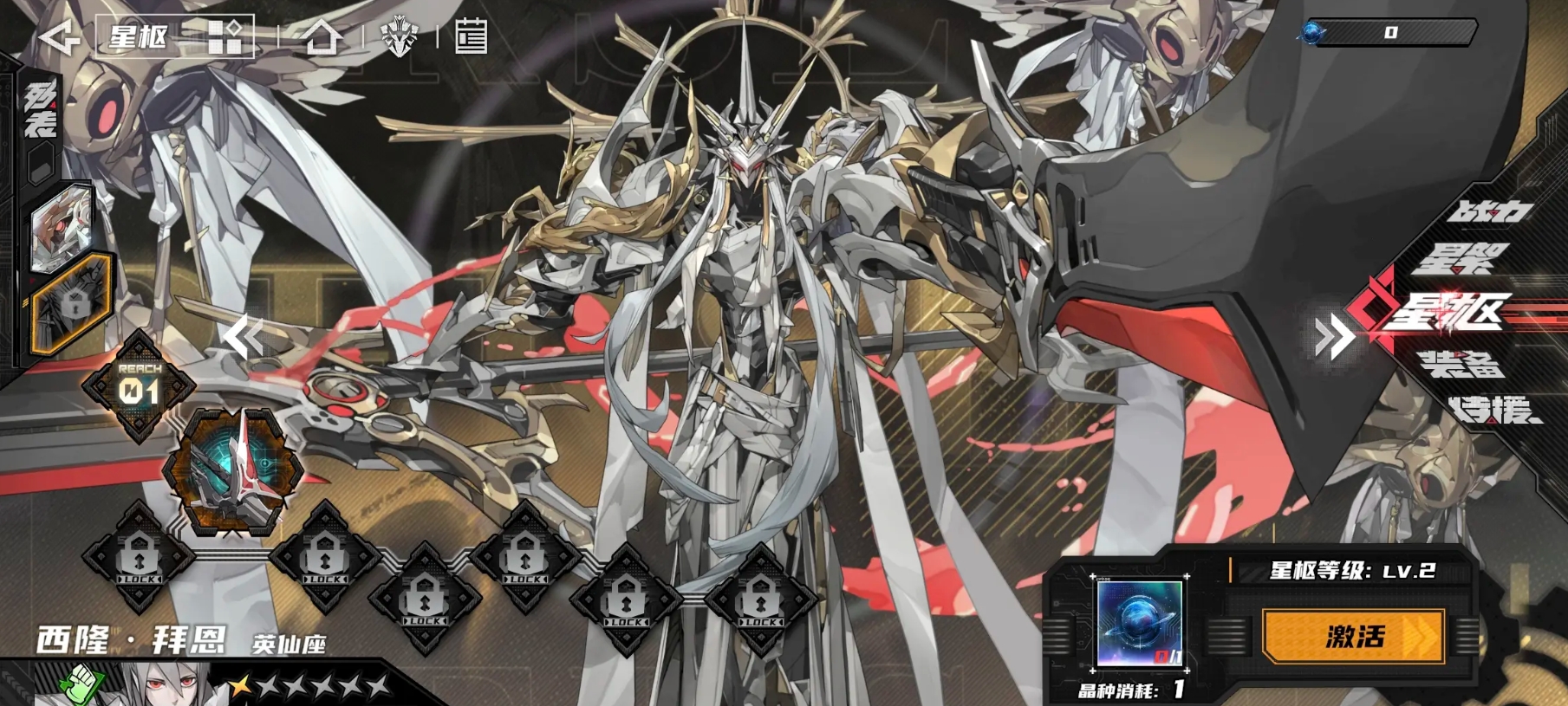 在游戏的养成玩法里,玩家们可找到星枢界面并在里面完成对星枢的激活。每名角色的星枢都有八个等级,每次成功完成对星枢的激活,都能令角色得到成长,且当各位将星枢提升至二级时,就能激活形态和技能,令角色在战斗中能进行机甲化,是比较重要的一个等级。此外,当玩家把星枢升至六级后,便能完成全技能的激活,也使得该等级的重要性仅次于二级。至于其它星枢等级则是在激活后为角色带来属性和能量的提升,虽然提升的幅度较大,但远不如二、六级。