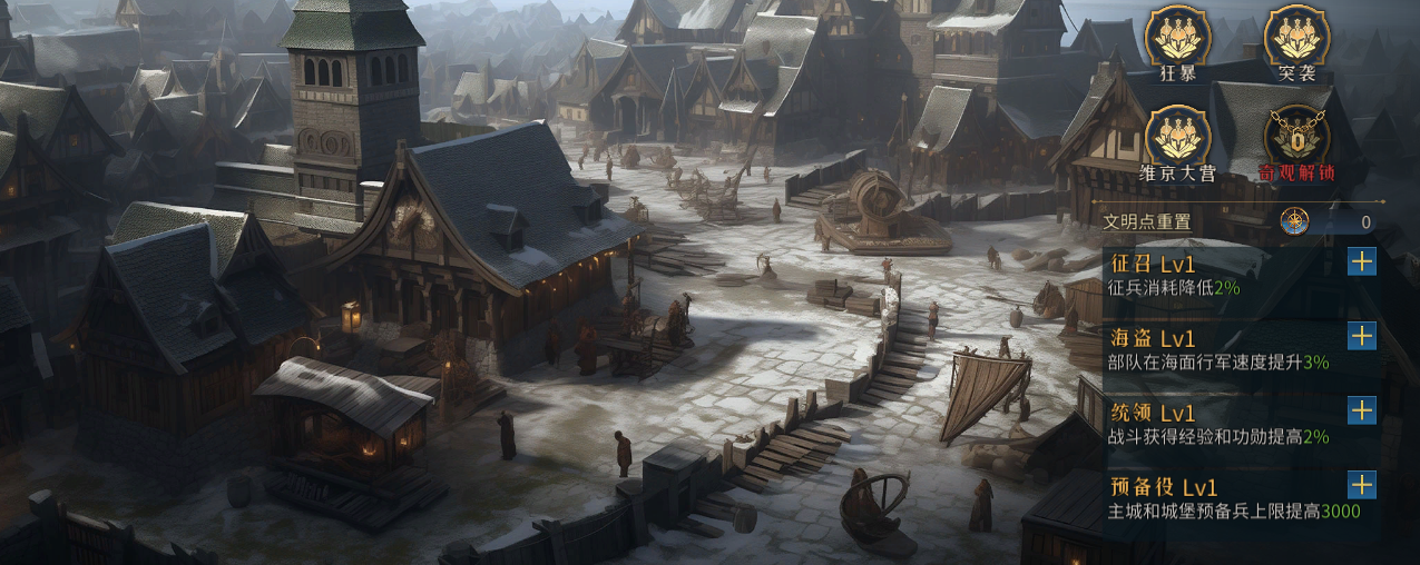 而维京文明的特性,征召:预备兵招募速度提升,征兵消耗降低2%、海盗:部队在海面行军速度提升3%,在海面进行战斗时,造成的伤害也相应提升、统领:部队士气上限提高,战斗获得经验和功勋提高2%、预备役:主城和城堡预备兵上限提高3000等等这一系列特性,可以说都是为战争与爆兵而服务,在前期其它文明,甚至还没有建造出自己的特色单位与建筑的时候,维京文明便已经在征战四方,攻城略地,一步步壮大自身了。