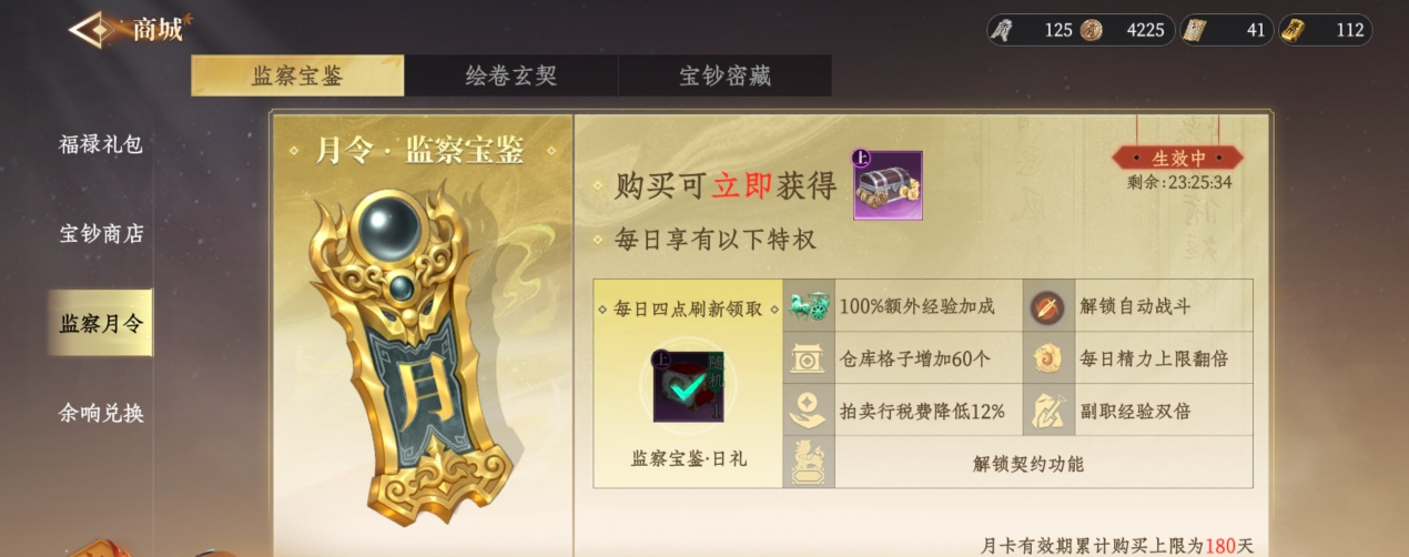 除了通过完成任务获得宝钞外,玩家还可以加入到拍卖行当中,对宝钞进行收入或者是售卖,这种模式,也可以大大缩短玩家获得宝钞的时间,所以对于幸运宝鉴和月令监察宝鉴,这两个选择来看,小编觉得幸运宝鉴,确实值得小氪一下,不仅能够缩短玩家们的月卡获得时间,而且在游戏当中有了月卡之后,能够解锁很多有价值的物资资源,增强游戏的流畅性。但如果你时间充裕是0氪党的话,那么也可以选择放弃幸运宝鉴的氪金活动,而是通过完成任务内容,来解锁宝钞,从而兑换月卡,具体的情况选择,还是要依据个人的需求来看,不过游戏氪金,还是需要理性消费,根据自身情况来完成合适的选择。
