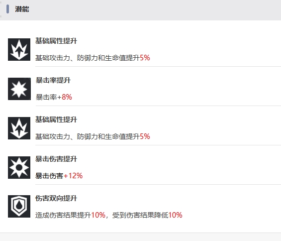 上面的特性能够最大化地发挥夜离的高暴击输出潜力,而在潜能方面,夜离同样拥有不错的成长潜力,其一为基础属性全面提升,能使基础攻击力、防御力和生命值均提高5%,全方位增强她的生存与输出能力,其二专注于暴击率的提升,直接为她增加8%的暴击率,提升她的爆发上限,再次强调的基础属性强化再次为她的各项数值带来提升,又一次将基础攻击力、防御力和生命值提升5%,暴击伤害也不甘示弱,获得12%的增幅,而伤害双向提升这一潜能则让她在战斗中不仅造成伤害结果提升10%,受到伤害结果也降低10%,达到攻守兼备的效果。