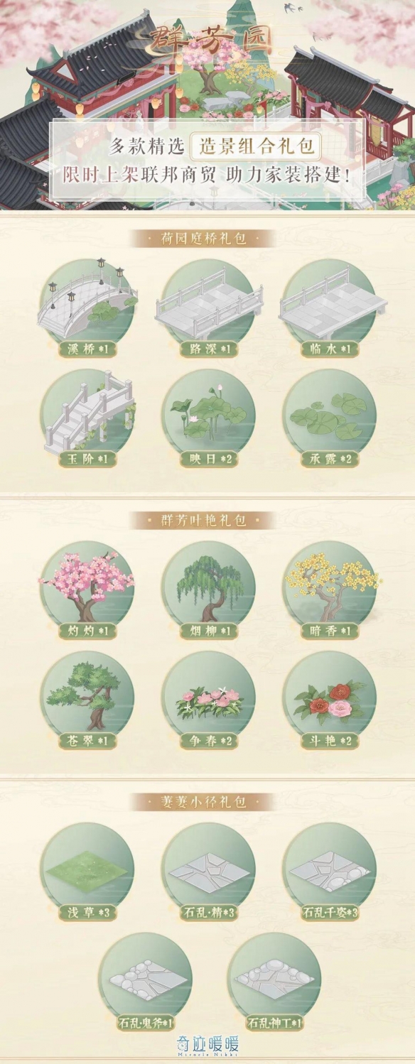 活动期间,联邦商贸将推出多款超值礼包,内含群芳园限定造景组合,助力园林家装搭建!礼包详情如下: